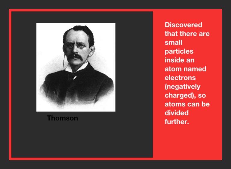 Discovered that there are small particles inside an atom named electrons (negatively charged), so atoms can be divided further.