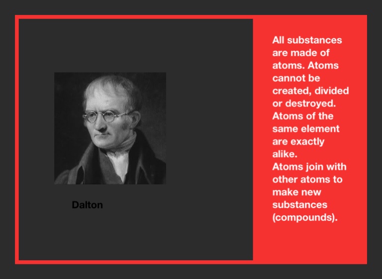 All substances are made of atoms. Atoms cannot be created, divided or destroyed. Atoms of the same element are exactly alike.