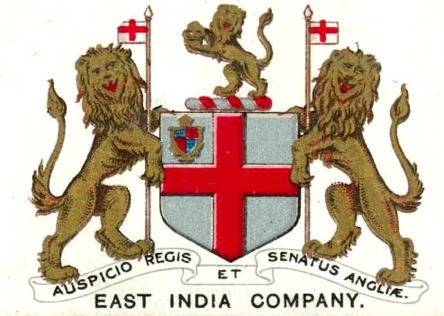 East India Company logo. The phrase "Auspicio Regis et Senatus Anglia" is Latin for "By the authority of the King and Parliament of England."