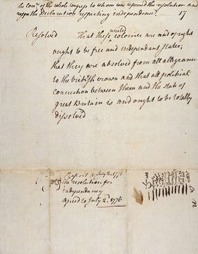 This document, written by Richard Henry Lee, was first proposed to the Continental Congress June 7, 1776. It states that "That these United Colonies are, and of right to be, free and independent States, that they are absolved from all allegiance to the British Crown, and that all political connection between them and the State of Great Britain is, and ought to be, totally dissolved."