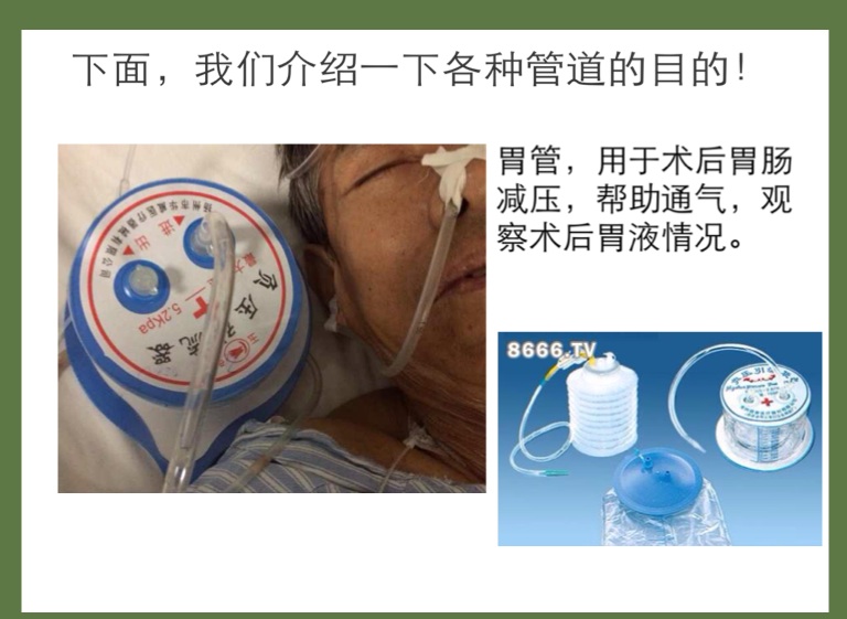 胃管,用于术后胃肠减压,帮助通气,观察术后胃液情况。