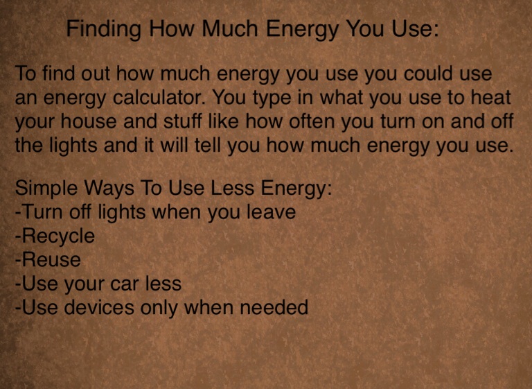 To find out how much energy you use you could use an energy calculator. You type in what you use to heat your house and stuff like how often you turn on and off the lights and it will tell you how much energy you use.