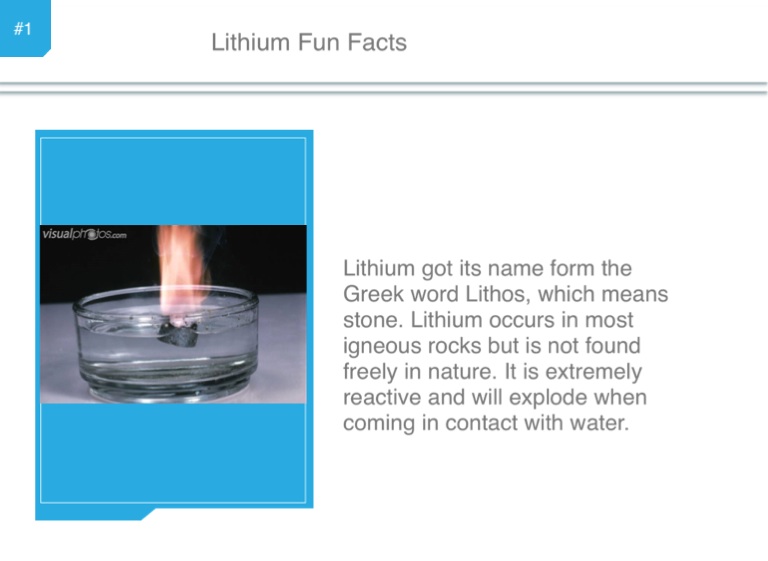 Lithium got its name form the Greek word Lithos, which means stone. Lithium occurs in most igneous rocks but is not found freely in nature. It is extremely reactive and will explode when coming in contact with water.