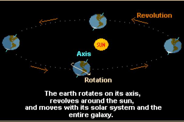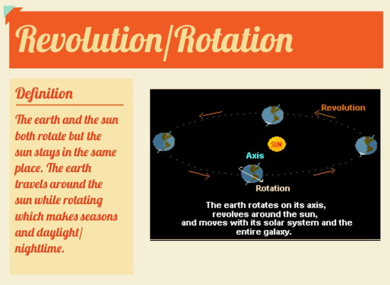 The earth and the sun both rotate but the sun stays in the same place. The earth travels around the sun while rotating which makes seasons and daylight/nighttime.