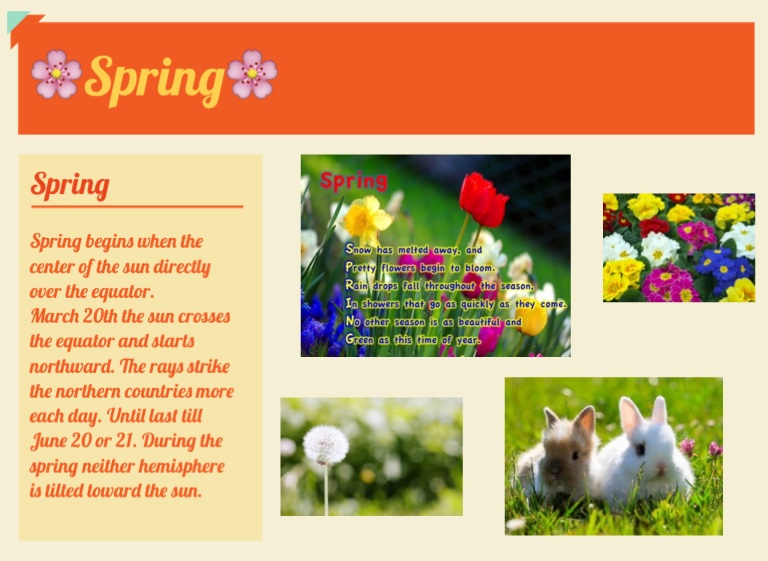 March 20th the sun crosses the equator and starts northward. The rays strike the northern countries more each day. Until last till June 20 or 21. During the spring neither hemisphere is tilted toward the sun.
