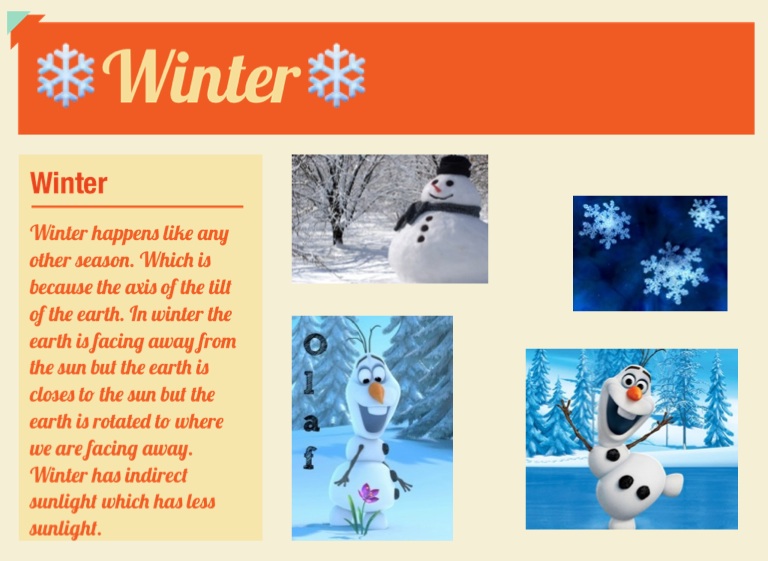 Winter happens like any other season. Which is because the axis of the tilt of the earth. In winter the earth is facing away from the sun but the earth is closes to the sun but the earth is rotated to where we are facing away. Winter has indirect sunlight which has less sunlight.