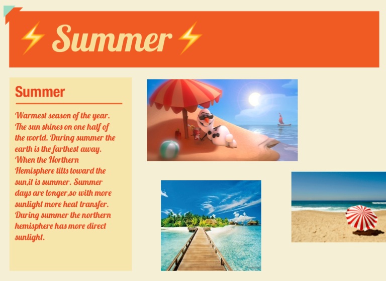 Warmest season of the year. The sun shines on one half of the world. During summer the earth is the farthest away. When the Northern Hemisphere tilts toward the sun,it is summer. Summer days are longer,so with more sunlight more heat transfer. During summer the northern hemisphere has more direct sunlight.