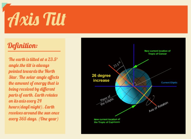The earth is tilted at a 23.5° angle.the tilt is always pointed towards the North Star. The solar angle affects the amount of energy that is being received by different parts of earth. Earth rotates on its axis every 24 hours(day&night). Earth revolves around the sun once every 365 days. (One year)