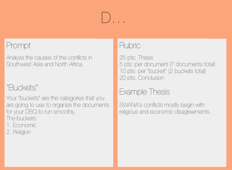 Your "buckets" are the categories that you are going to use to organize the documents for your DBQ to run smoothly.