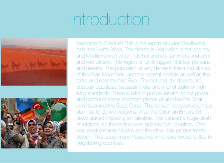 Welcome to SWANA! This is the region includes Southwest Asia and North Africa. The climate is Arid which is hot and dry and Mediterranean which has hot and dry summers and cool and wet winters. This region is full of rugged hillsides, plateaus and deserts. The population is very dense in the moist slopes of the Atlas Mountains, and the coastal districts as well as the fertile land near the Nile River. The hot and dry deserts are scarcely populated because there isn't a lot of water or high living standards. There is a lot of political tension about power and control of some important pieces of land like the Sinai peninsula and the Suez Canal. This tension between countries also has to do with religions. After the Ottoman Empire fell, Jews started migrating to Palestine. This caused a huge clash of religions, so the territory was split into two countries. One was predominantly Muslim and the other was predominantly Jewish. This upset many Palestines who were forced to flee to neighboring countries.