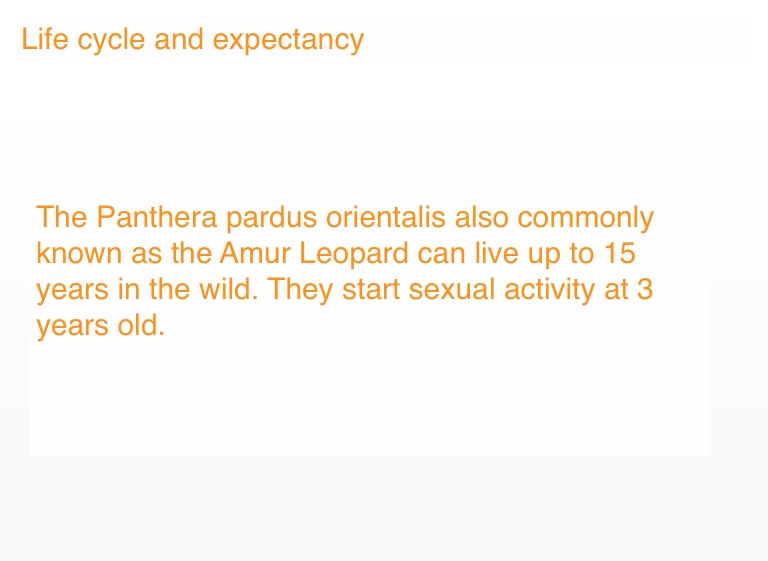 The Panthera pardus orientalis also commonly known as the Amur Leopard can live up to 15 years in the wild. They start sexual activity at 3 years old.