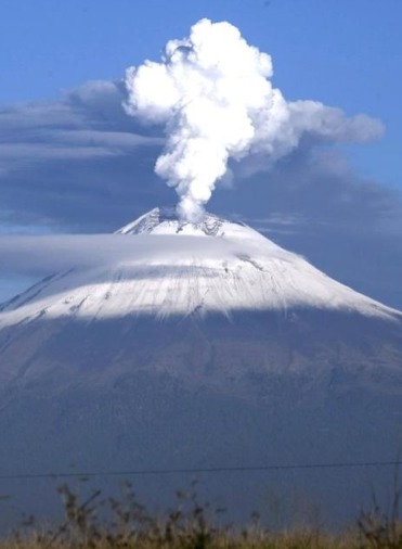 A plume of steam and ash rises above Popocatepetl , whose Aztec name means " Smoking Mountain". Frequent historical eruptions have been recorded since the precolumbian era.