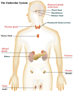 Endocrine system- Glands secrete hormones that regulate processes such as growth, reproduction and nutrient use (metabolism) by body cells. Consists of pineal gland, pituitary gland, thyroid gland, thymus, adrenal gland, pancreas, ovary, and testis.