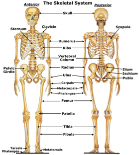 Skeletal system- Protects and supports body organs, provides a framework the muscles use to cause movement; blood cells are formed within bones, stores minerals. Consists of Joints and Bones