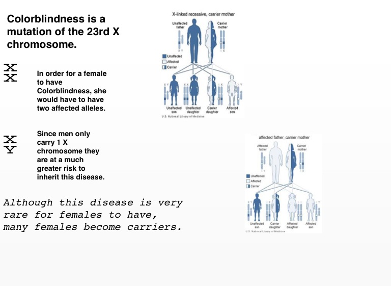 In order for a female to have Colorblindness, she would have to have two affected alleles.