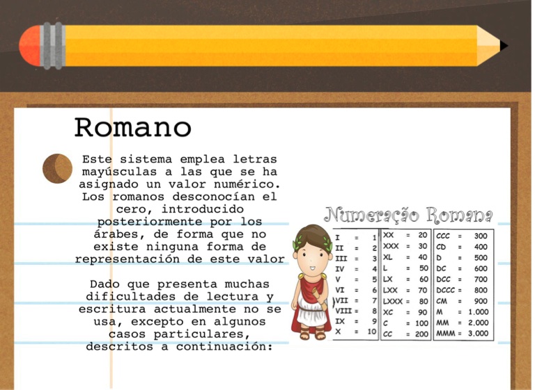 Este sistema emplea letras mayúsculas a las que se ha asignado un valor numérico. Los romanos desconocían el cero, introducido posteriormente por los árabes, de forma que no existe ninguna forma de representación de este valor