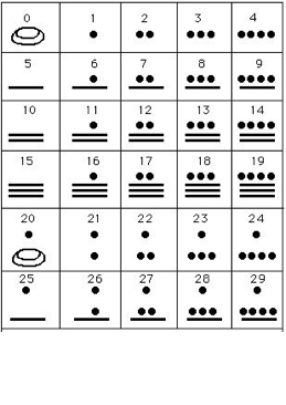 Se representa mediante puntos(valor de uno), rayas (valor de cinco) y concha (valor de cero) , que debidamente colocados hacen que tengamos muchas variables de números. Es aditivo, porque se suman los valores de los símbolos para conocer un número.