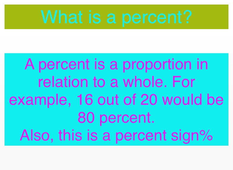A percent is a proportion in relation to a whole. For example, 16 out of 20 would be 80 percent.