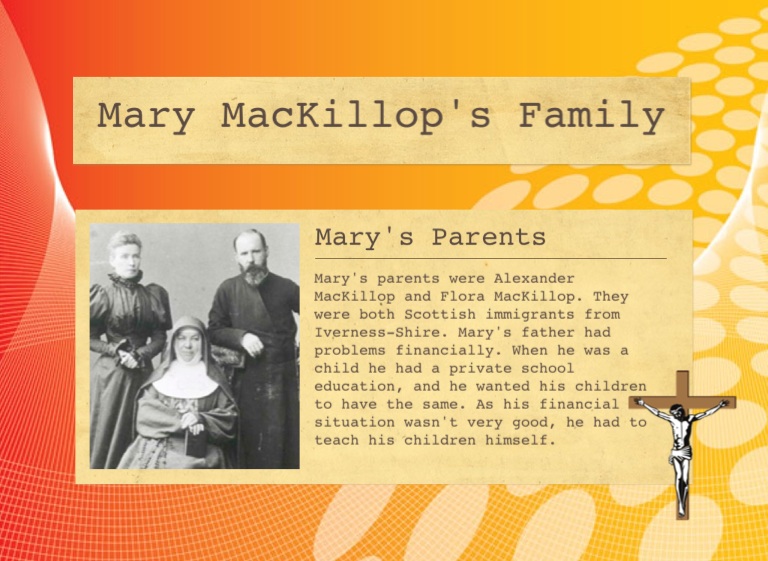 Mary's parents were Alexander MacKillop and Flora MacKillop. They were both Scottish immigrants from Iverness-Shire. Mary's father had problems financially. When he was a child he had a private school education, and he wanted his children to have the same. As his financial situation wasn't very good, he had to teach his children himself.