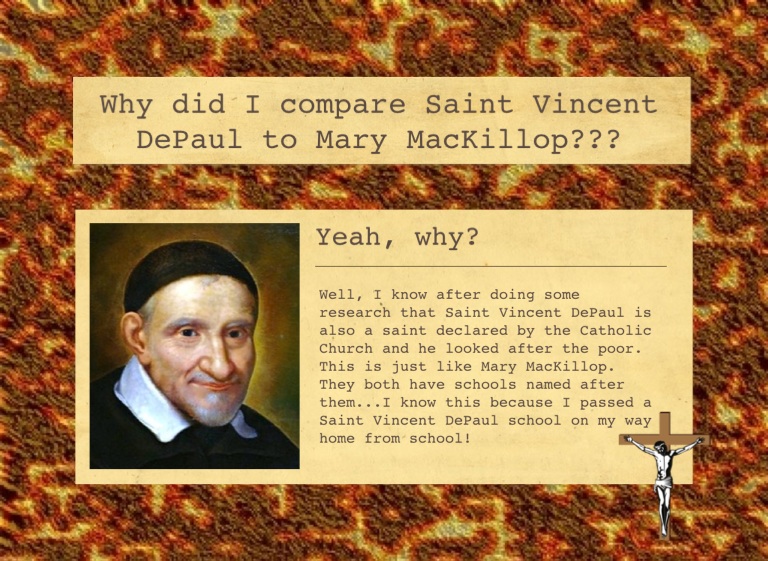Well, I know after doing some research that Saint Vincent DePaul is also a saint declared by the Catholic Church and he looked after the poor. This is just like Mary MacKillop. They both have schools named after them...I know this because I passed a Saint Vincent DePaul school on my way home from school!