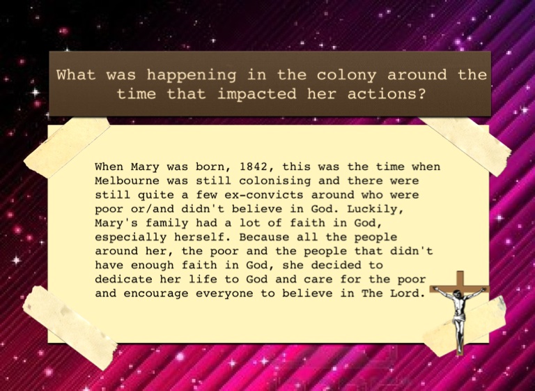 When Mary was born, 1842, this was the time when Melbourne was still colonising and there were still quite a few ex-convicts around who were poor or/and didn't believe in God. Luckily, Mary's family had a lot of faith in God, especially herself. Because all the people around her, the poor and the people that didn't have enough faith in God, she decided to dedicate her life to God and care for the poor and encourage everyone to believe in The Lord.