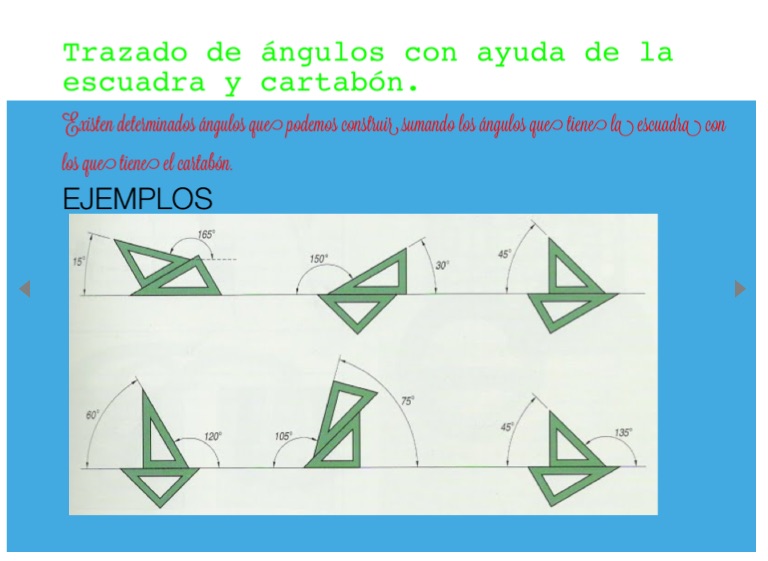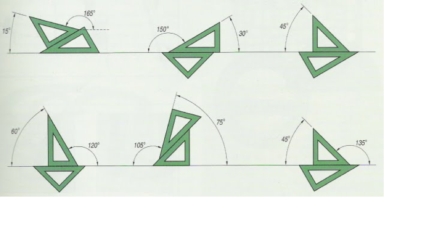 Existen determinados ángulos que podemos construir sumando los ángulos que tiene la escuadra con los que tiene el cartabón.