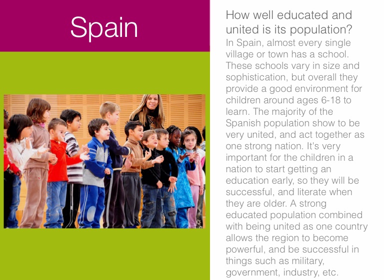 In Spain, almost every single village or town has a school. These schools vary in size and sophistication, but overall they provide a good environment for children around ages 6-18 to learn. The majority of the Spanish population show to be very united, and act together as one strong nation. It's very important for the children in a nation to start getting an education early, so they will be successful, and literate when they are older. A strong educated population combined with being united as one country allows the region to become powerful, and be successful in things such as military, government, industry, etc.