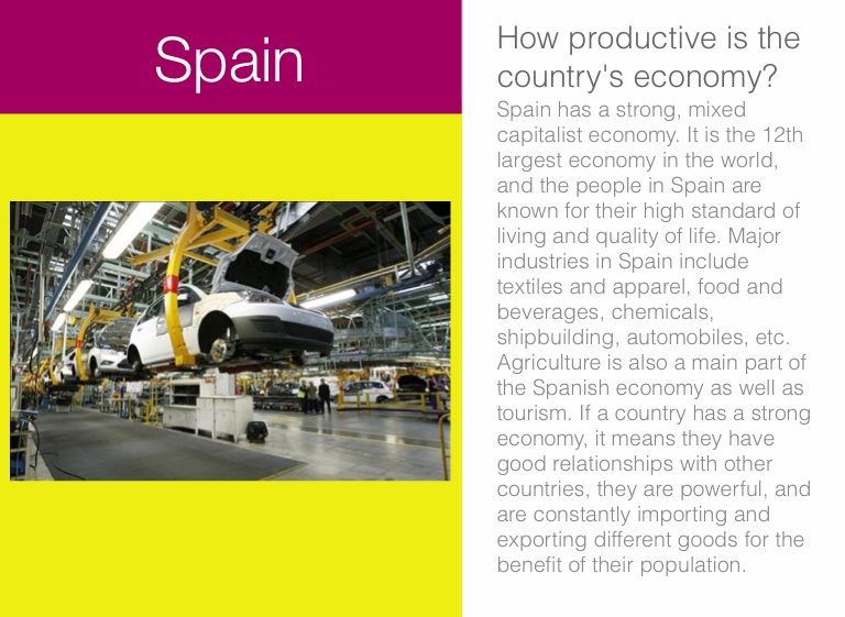 Spain has a strong, mixed capitalist economy. It is the 12th largest economy in the world, and the people in Spain are known for their high standard of living and quality of life. Major industries in Spain include textiles and apparel, food and beverages, chemicals, shipbuilding, automobiles, etc. Agriculture is also a main part of the Spanish economy as well as tourism. If a country has a strong economy, it means they have good relationships with other countries, they are powerful, and are constantly importing and exporting different goods for the benefit of their population.