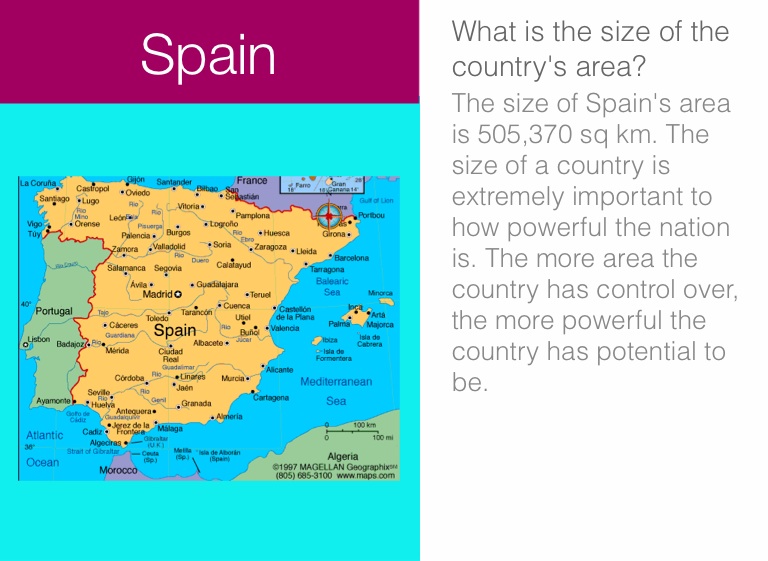 The size of Spain's area is 505,370 sq km. The size of a country is extremely important to how powerful the nation is. The more area the country has control over, the more powerful the country has potential to be.