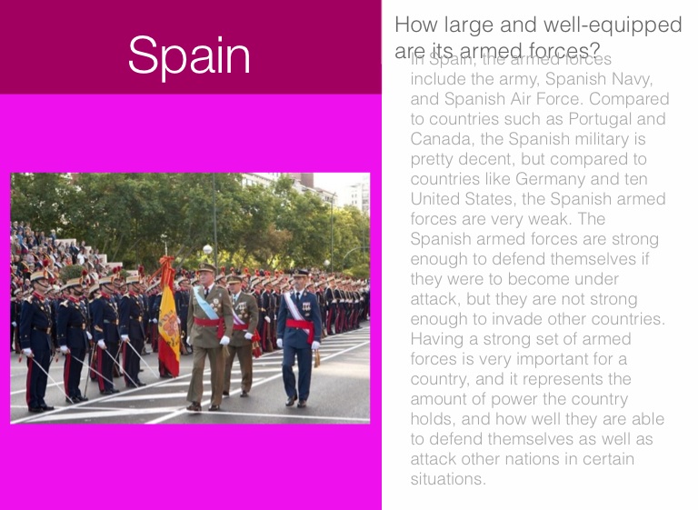 In Spain, the armed forces include the army, Spanish Navy, and Spanish Air Force. Compared to countries such as Portugal and Canada, the Spanish military is pretty decent, but compared to countries like Germany and ten United States, the Spanish armed forces are very weak. The Spanish armed forces are strong enough to defend themselves if they were to become under attack, but they are not strong enough to invade other countries. Having a strong set of armed forces is very important for a country, and it represents the amount of power the country holds, and how well they are able to defend themselves as well as attack other nations in certain situations.
