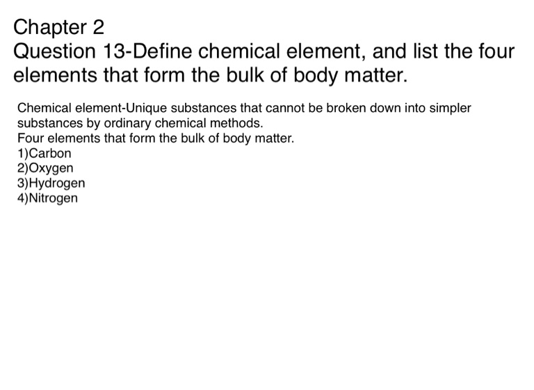 Question 13-Define chemical element, and list the four elements that form the bulk of body matter.