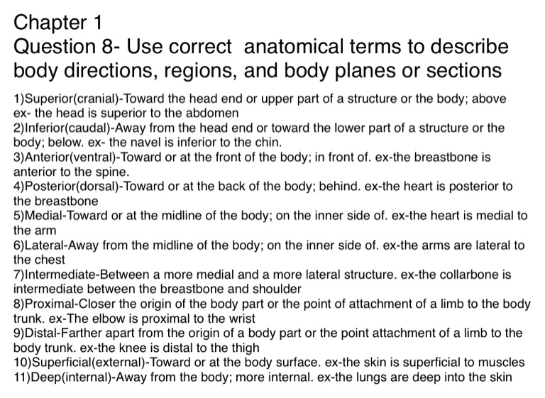 Question 8- Use correct anatomical terms to describe body directions, regions, and body planes or sections