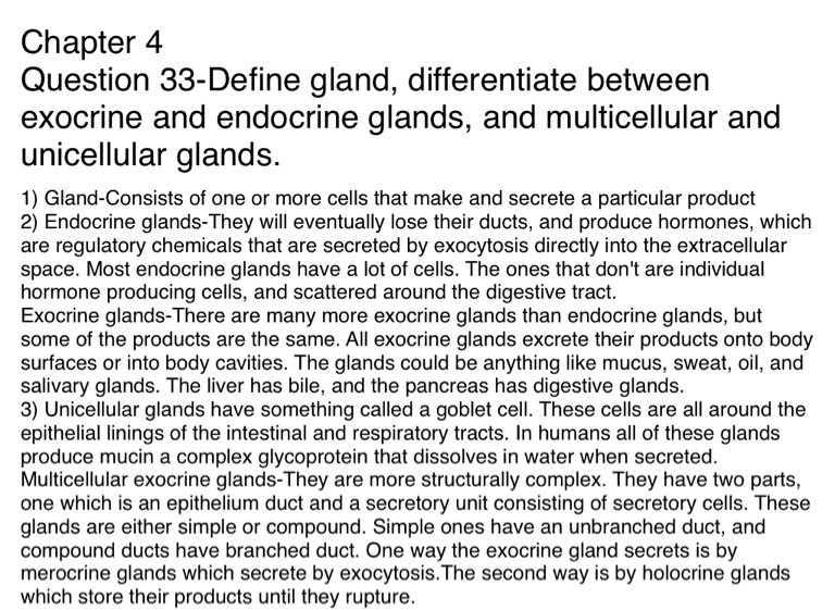 Question 33-Define gland, differentiate between exocrine and endocrine glands, and multicellular and unicellular glands.