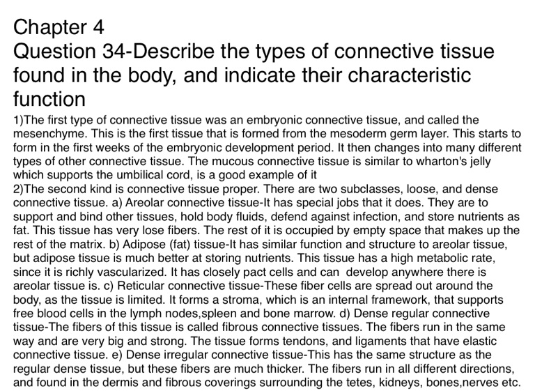 Question 34-Describe the types of connective tissue found in the body, and indicate their characteristic function