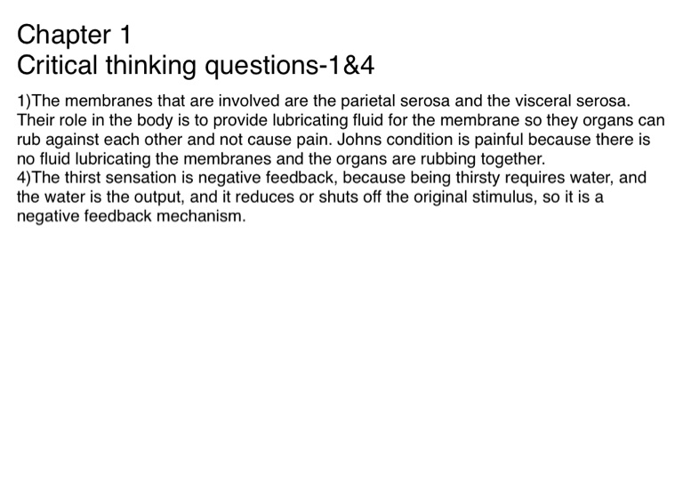 1)The membranes that are involved are the parietal serosa and the visceral serosa. Their role in the body is to provide lubricating fluid for the membrane so they organs can rub against each other and not cause pain. Johns condition is painful because there is no fluid lubricating the membranes and the organs are rubbing together.