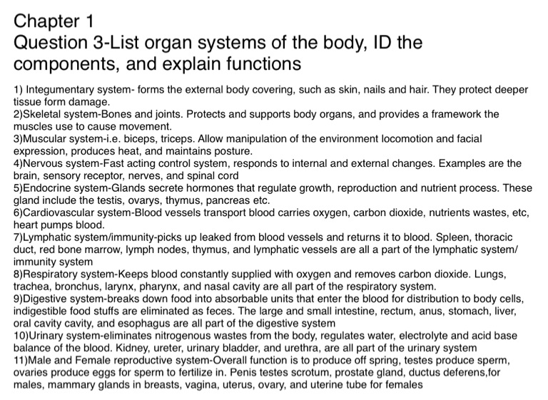 Question 3-List organ systems of the body, ID the components, and explain functions