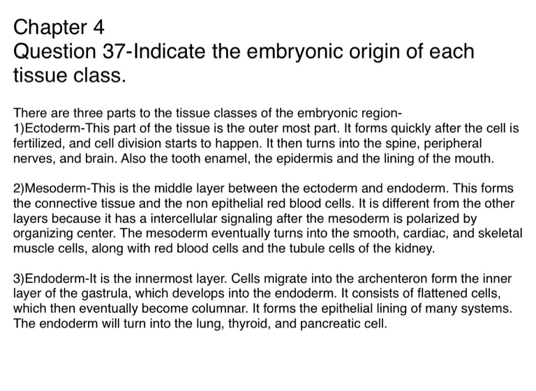 1)Ectoderm-This part of the tissue is the outer most part. It forms quickly after the cell is fertilized, and cell division starts to happen. It then turns into the spine, peripheral nerves, and brain. Also the tooth enamel, the epidermis and the lining of the mouth.