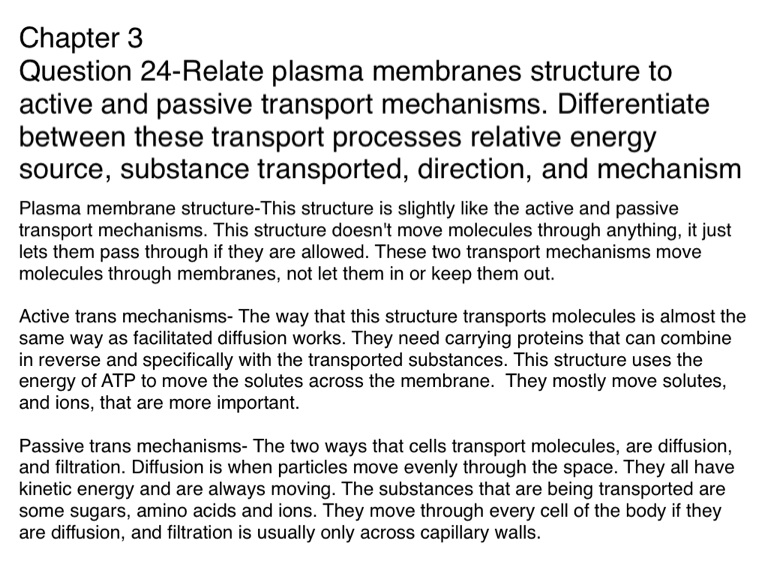 Question 24-Relate plasma membranes structure to active and passive transport mechanisms. Differentiate between these transport processes relative energy source, substance transported, direction, and mechanism