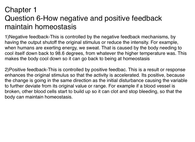 1)Negative feedback-This is controlled by the negative feedback mechanisms, by having the output shutoff the original stimulus or reduce the intensity. For example, when humans are exerting energy, we sweat. That is caused by the body needing to cool itself down back to 98.6 degrees, from whatever the higher temperature was. This makes the body cool down so it can go back to being at homeostasis