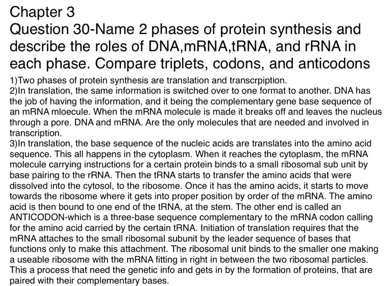 Question 30-Name 2 phases of protein synthesis and describe the roles of DNA,mRNA,tRNA, and rRNA in each phase. Compare triplets, codons, and anticodons