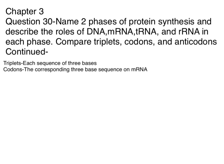 Question 30-Name 2 phases of protein synthesis and describe the roles of DNA,mRNA,tRNA, and rRNA in each phase. Compare triplets, codons, and anticodons