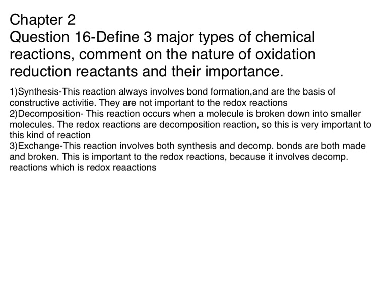 Question 16-Define 3 major types of chemical reactions, comment on the nature of oxidation reduction reactants and their importance.