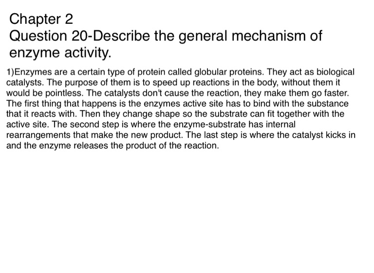 1)Enzymes are a certain type of protein called globular proteins. They act as biological catalysts. The purpose of them is to speed up reactions in the body, without them it would be pointless. The catalysts don't cause the reaction, they make them go faster. The first thing that happens is the enzymes active site has to bind with the substance that it reacts with. Then they change shape so the substrate can fit together with the active site. The second step is where the enzyme-substrate has internal rearrangements that make the new product. The last step is where the catalyst kicks in and the enzyme releases the product of the reaction.