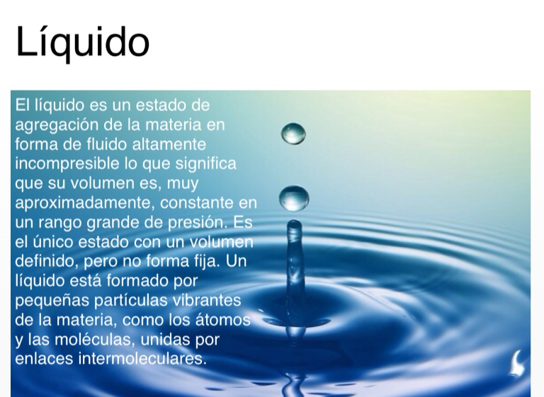 El líquido es un estado de agregación de la materia en forma de fluido altamente incompresible lo que significa que su volumen es, muy aproximadamente, constante en un rango grande de presión. Es el único estado con un volumen definido, pero no forma fija. Un líquido está formado por pequeñas partículas vibrantes de la materia, como los átomos y las moléculas, unidas por enlaces intermoleculares.