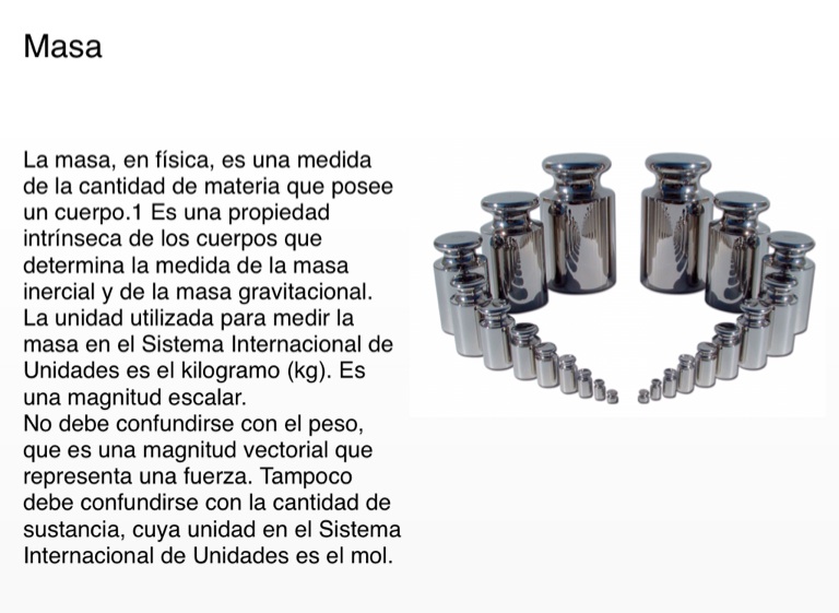 La masa, en física, es una medida de la cantidad de materia que posee un cuerpo.1 Es una propiedad intrínseca de los cuerpos que determina la medida de la masa inercial y de la masa gravitacional. La unidad utilizada para medir la masa en el Sistema Internacional de Unidades es el kilogramo (kg). Es una magnitud escalar.