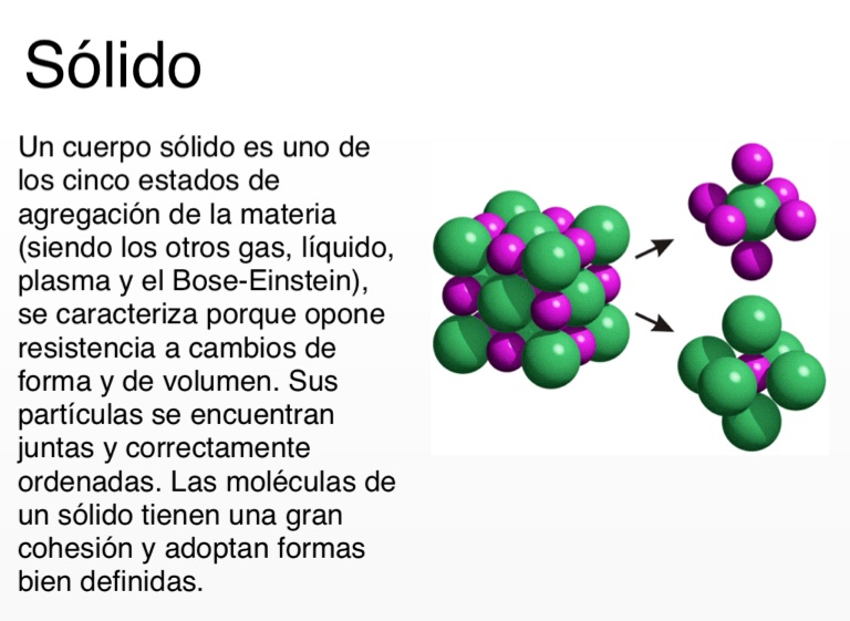 Un cuerpo sólido es uno de los cinco estados de agregación de la materia (siendo los otros gas, líquido, plasma y el Bose-Einstein), se caracteriza porque opone resistencia a cambios de forma y de volumen. Sus partículas se encuentran juntas y correctamente ordenadas. Las moléculas de un sólido tienen una gran cohesión y adoptan formas bien definidas.
