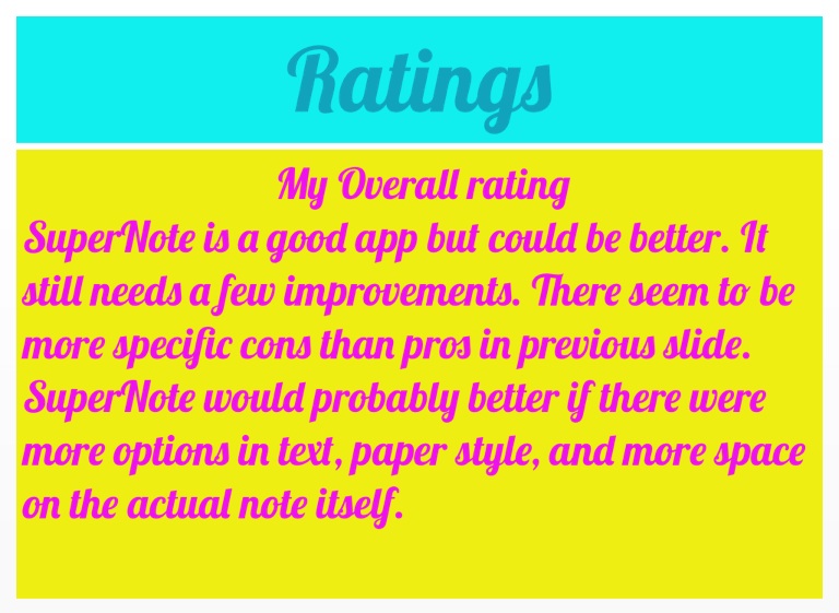 SuperNote is a good app but could be better. It still needs a few improvements. There seem to be more specific cons than pros in previous slide. SuperNote would probably better if there were more options in text, paper style, and more space on the actual note itself.