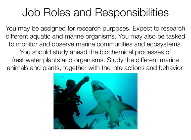 You may be assigned for research purposes. Expect to research different aquatic and marine organisms. You may also be tasked to monitor and observe marine communities and ecosystems. You should study ahead the biochemical processes of freshwater plants and organisms. Study the different marine animals and plants, together with the interactions and behavior.