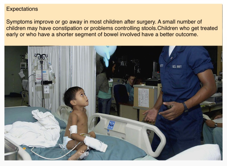 Symptoms improve or go away in most children after surgery. A small number of children may have constipation or problems controlling stools.Children who get treated early or who have a shorter segment of bowel involved have a better outcome.