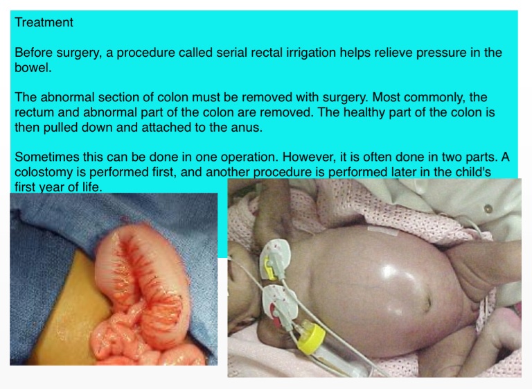 Sometimes this can be done in one operation. However, it is often done in two parts. A colostomy is performed first, and another procedure is performed later in the child's first year of life.